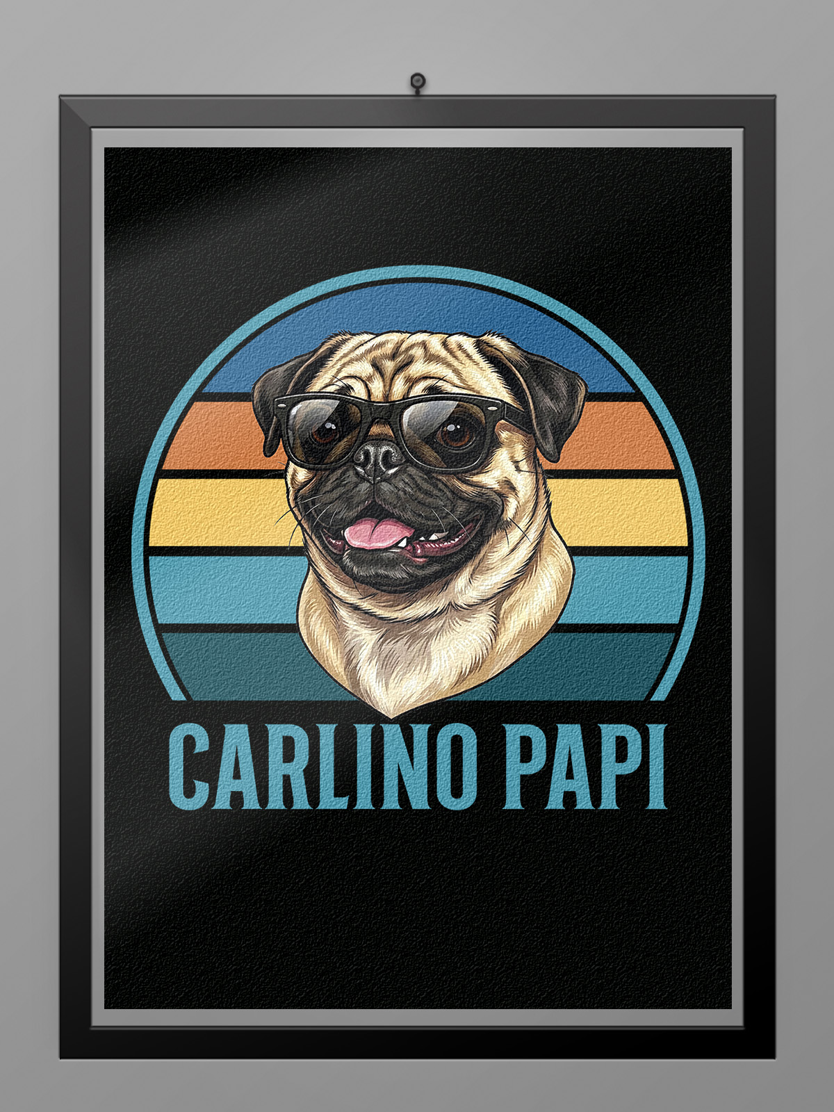 Un diseño con mucha calle Para esta versión masculina nos hemos alejado de los clichés y hemos apostado por algo verdaderamente cañero. La ilustración nos trae a tu Carlino luciendo unas gafas de sol oscuras, plantado sobre un atardecer de marcado estilo ochentero. La paleta de colores fríos y cálidos, combinando azules, amarillos y naranjas, le da un contraste visual muy potente y marcadamente masculino. Es la prenda ideal para ponerte con tus jeans de confianza y unas buenas zapatillas y salir a devorar la ciudad.